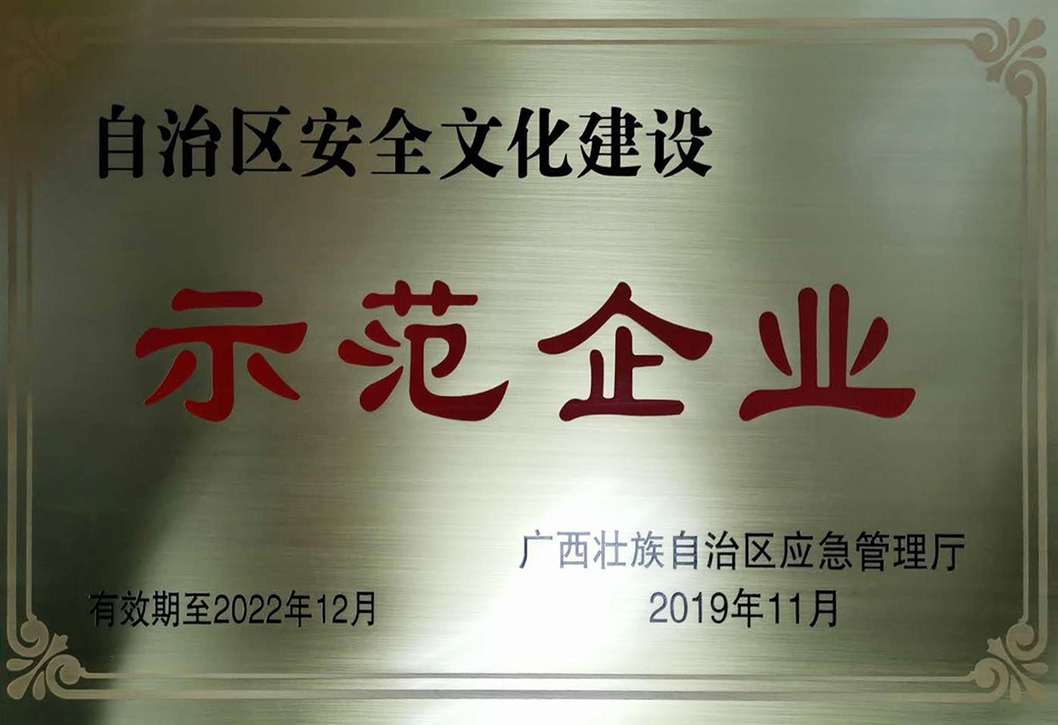 2019年評為自治區安全文化建設示范企業