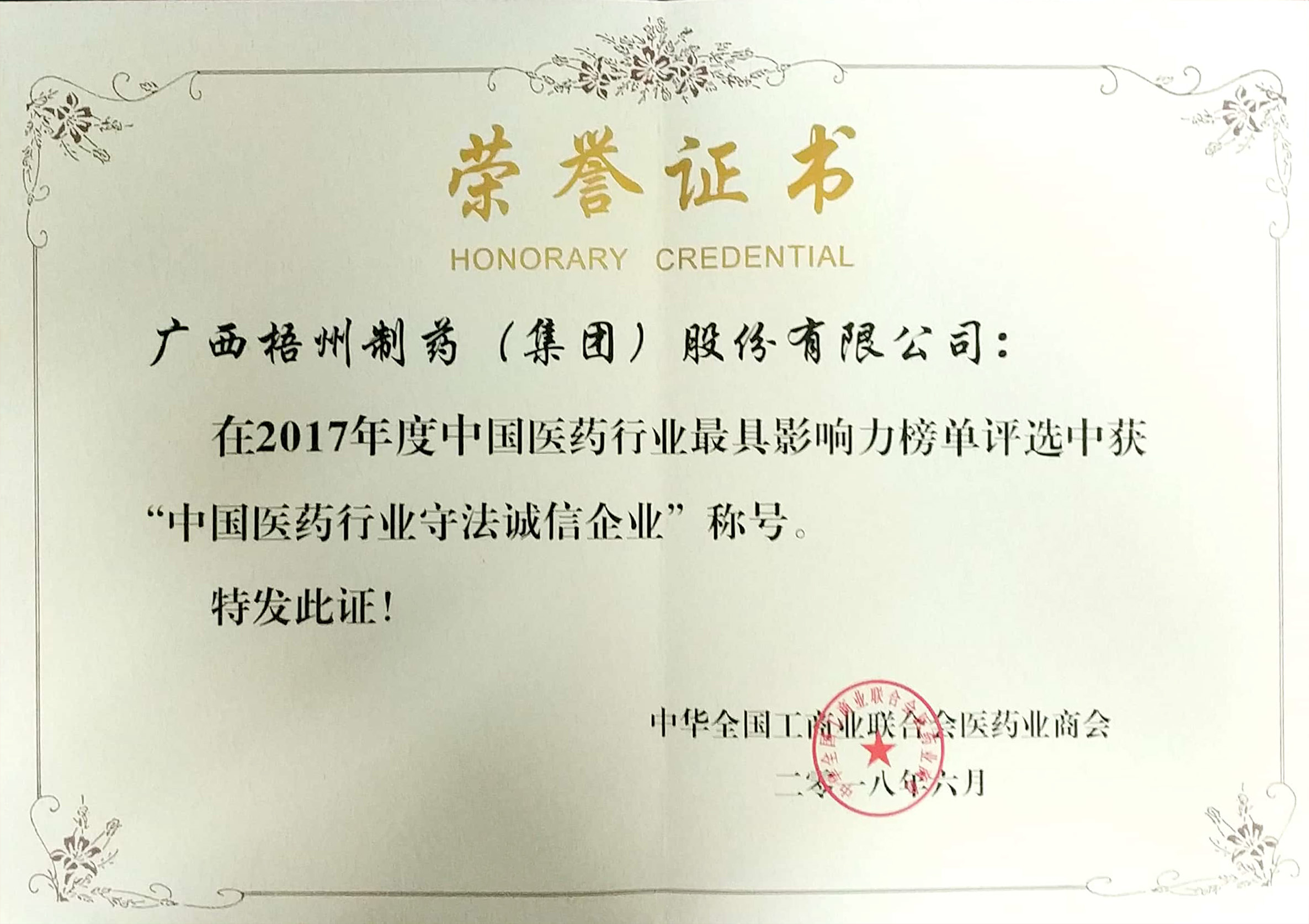 榮獲2017年度中國醫藥行業守法誠信企業稱號