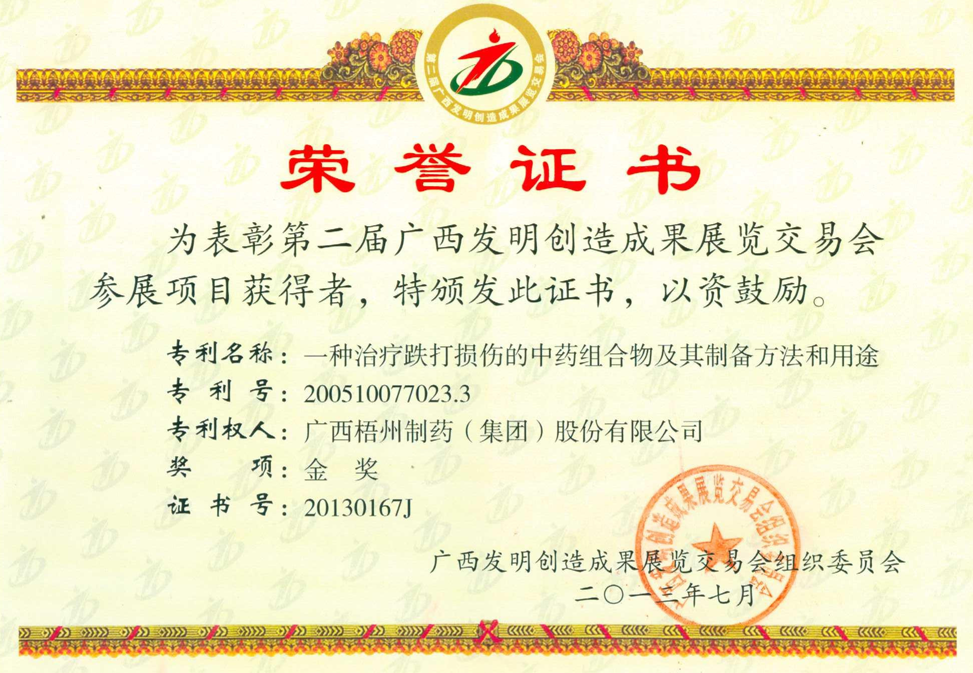 《一種治療跌打損傷的中藥組合物及其制備方法和用途》專利榮獲廣西發(fā)明創(chuàng)造成果展覽交易會參展項目金獎