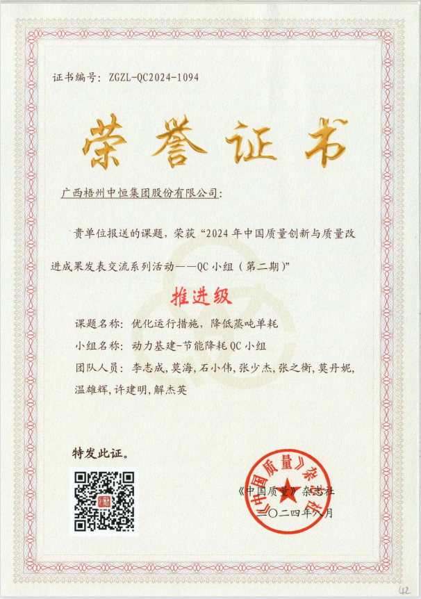 近日,梧州制藥動力基建車間的《優化運行措施,降低蒸噸單耗》項目成果在2024年全國QC小組成果發表交流活動中,獲“推進級”成果稱號。