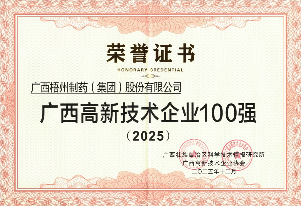 廣西梧州制藥(集團)股份有限公司獲評2025年廣西高新技術企業100強