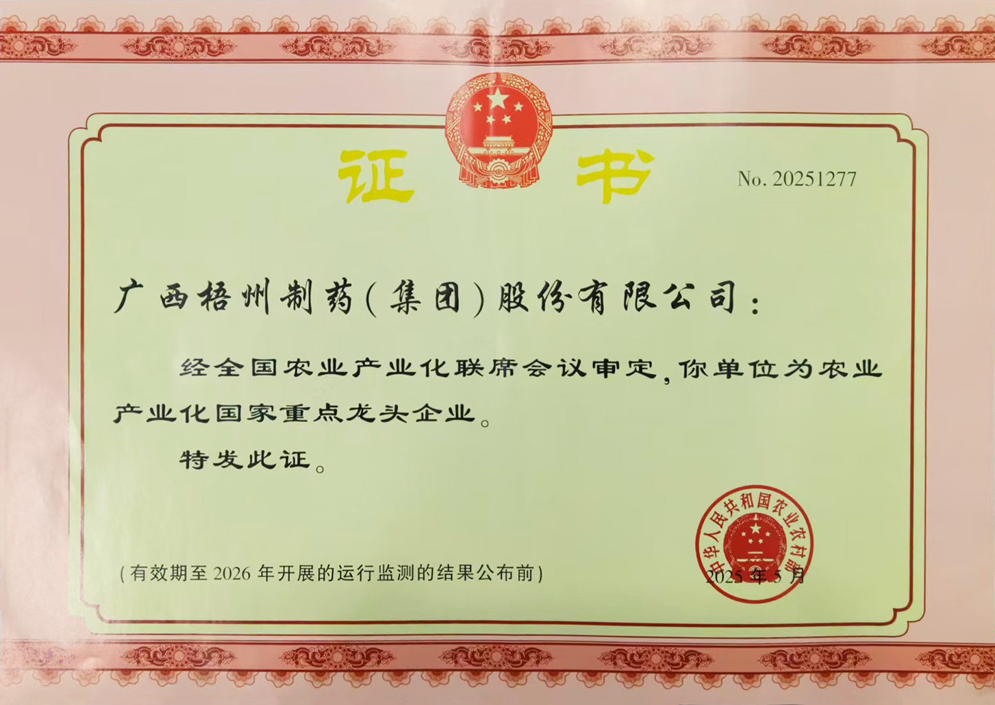 廣西梧州制藥(集團)股份有限公司獲評農業產業化國家重點龍頭企業