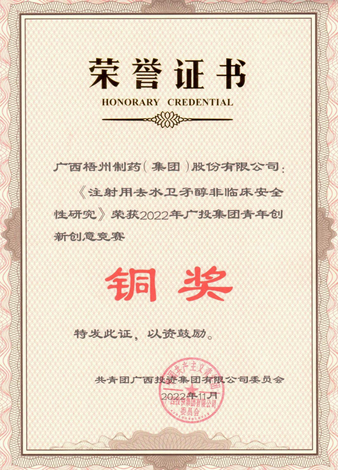 近日,由梧州制藥質量保證部組成的梧州制藥代表隊——“質量衛士”隊,憑借項目《注射用去水衛矛醇非臨床安全性研究》獲得2022年廣投集團青年創新創意競賽銅獎的表彰。本次競賽共有16個項目最終入圍決賽,通過視頻會議的